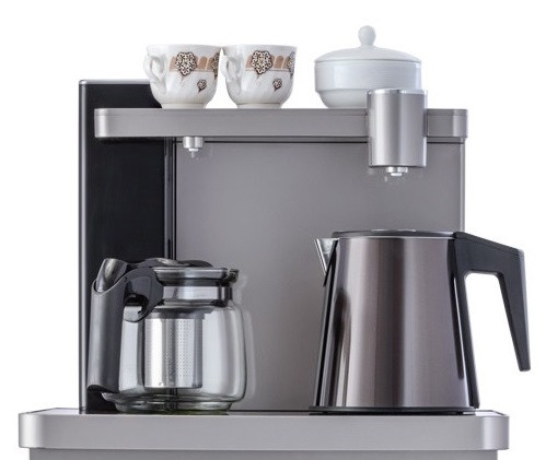В комплекте с чайным столиком два стильных чайника: для кипятка и заварочный, которые наполняются из специального крана, интегрированного в столешницу с электронным управлением. Так же предусмотрена удобная полочка для чашек |